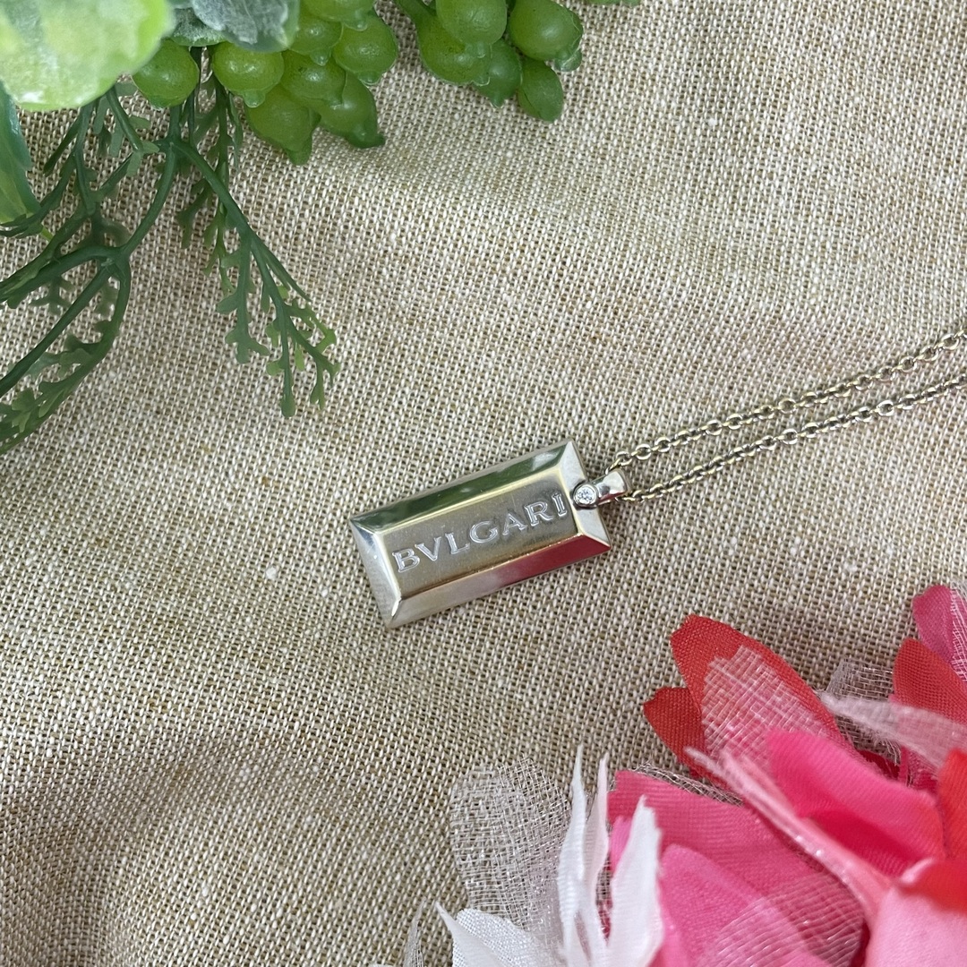 インゴットをモチーフにしたデザインで、ダイヤモンドもついておりブルガリのロゴが刻まれた素敵なネックレスですね!